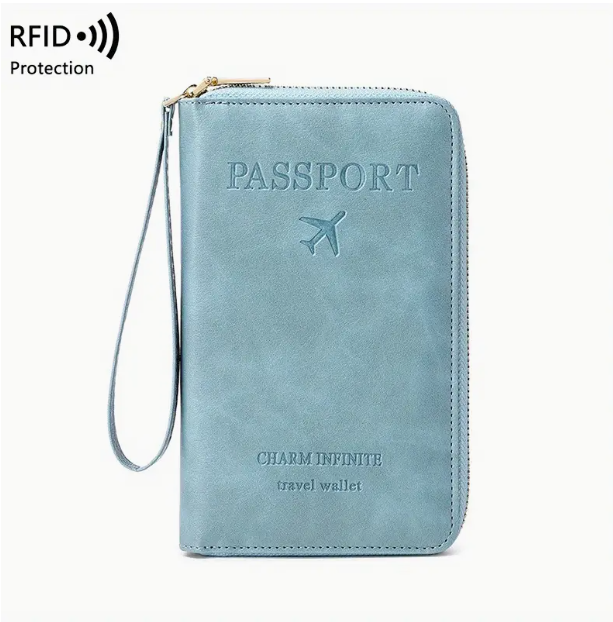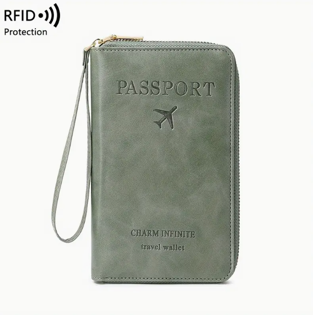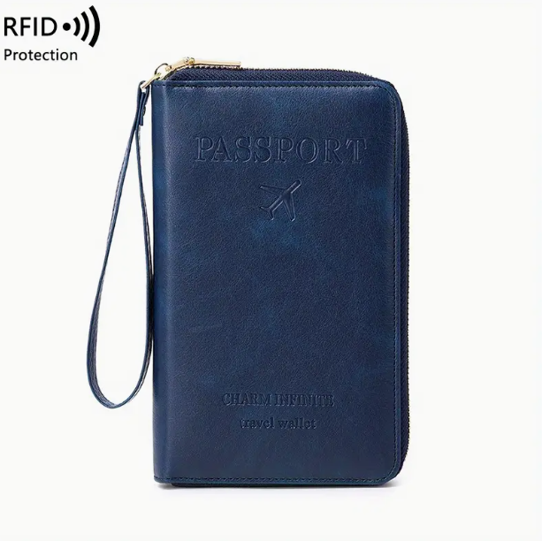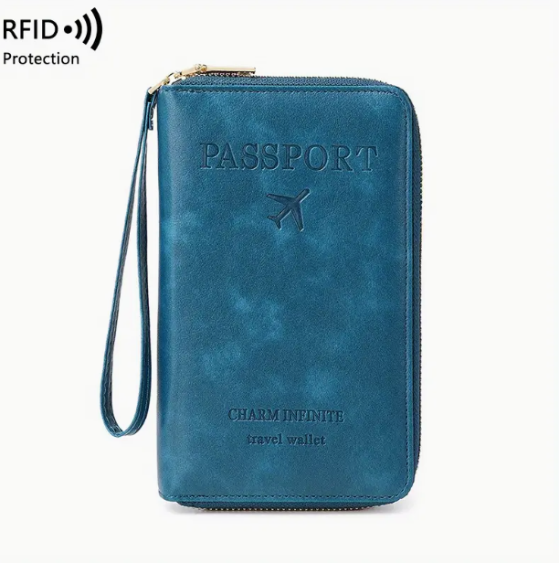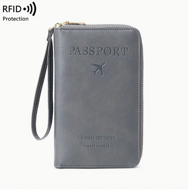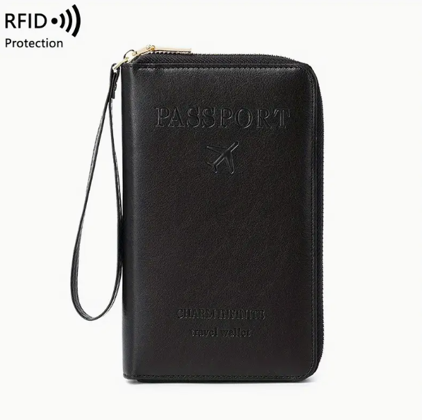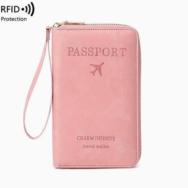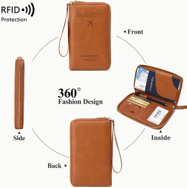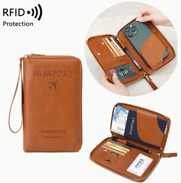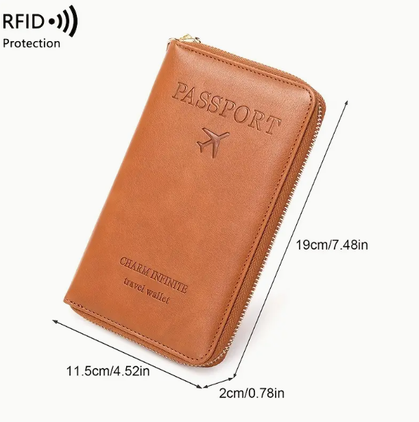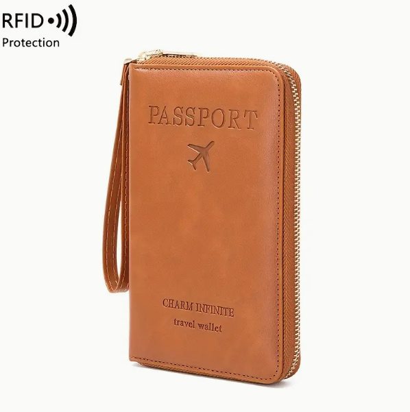 Cartera de pasaporte de piel sintética con bloqueo RFID - Anti-robo, organizador de viaje multifunción con cremallera y pulsera, diseño de símbolo de avión e infinito, marrón, para tarjetas de crédito y billetes, forro de poliéster, correa superior de un solo asa